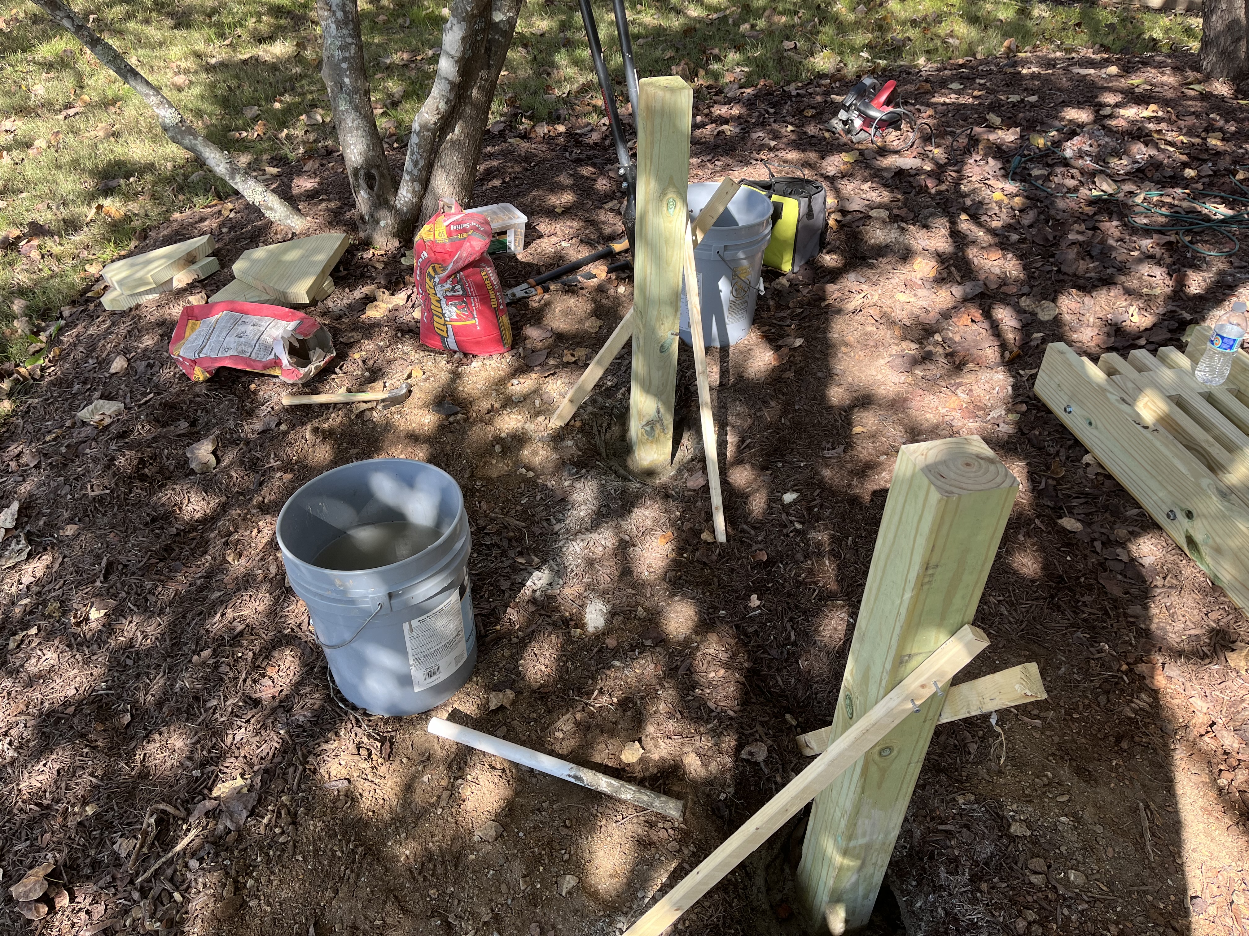 The second day, taking place on October 27, involved installing a bench under the large flowerbed with the two trees. The bench, assembled by me and my dad in our garage after the first project day, had its design reverse-engineered from another bench we had seen at a nearby park.